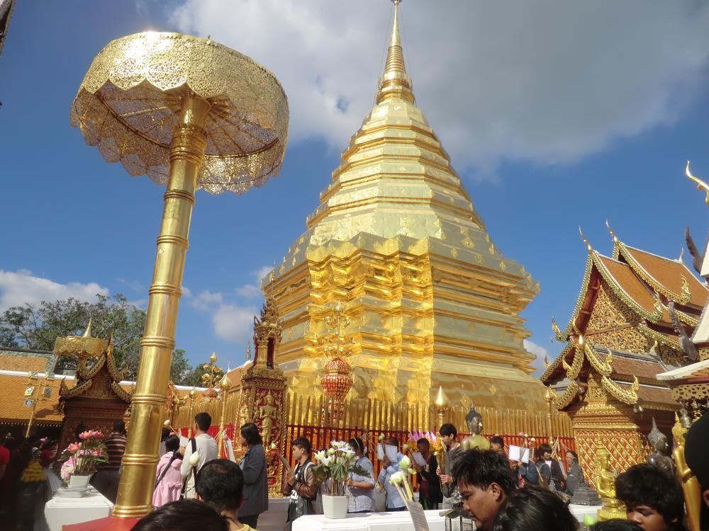 El templo Wat Phra That Doi Suthep se encuentra sobre una colina desde donde se tienen vistas de toda la ciudad de Chiang Mai . Para entrar, hay que subir unos 300 escalones hasta arriba de todo y pagar los 30 BHT / persona que vale la entrada. En total nos hemos estado 2 horas paseando por el templo, tanto para la zona exterior (desde donde se puede contemplar la panorámica de Chiang Mai) como para la zona interior, preciosa, en que hay que entrar descalzo. Realmente es el templo más bonito que hemos visto hasta ahora! A las 18h los monjes han puesto a rezar allí mismo; vale la pena quedarse a ver el ritual! Además, éramos muy poca gente y había tranquilidad absoluta. Al salir del templo nos hemos encontrado el taxista en la puerta esperándonos, prácticamente él solo, con una sonrisa encantador. 40 minutos y ya estábamos de nuevo en el centro de Chiang Mai.